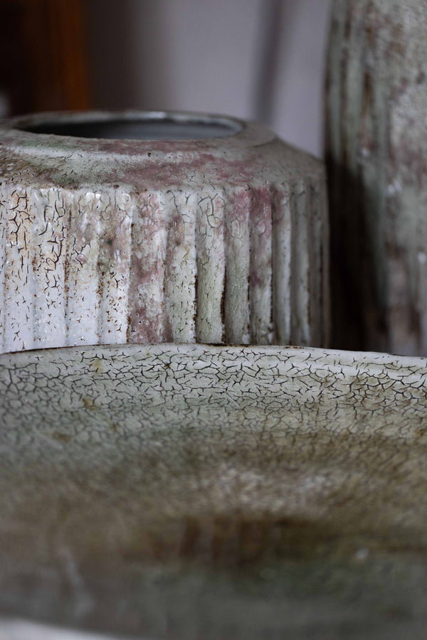 Akiko's title for the show, "Rin-ne Tensho 輪廻転生", relates to reincarnation and the cycles of life. Alongside her inspiration from the changing seasons, she relates to a sense of circularity in her process - the cyclical nature of accumulation and disintegration."In the plates, it's the thickness of the slip underneath; under the white slip, which crackles, it’s dark. You rotate the plate after applying it, to move the slip around; where it’s the thicker part, it’s the bigger crack, where it’s the thinner part, it’s the finer crack. Where it’s thinly applied and you can see more green, you can see things growing. This is accumulation. The Moon Jar is also about many things accumulated, growing… the very quiet ones too. When the accumulation gets too much, it comes off. It’s the natural cycle. It’s circulating. In a word, this is Rin-ne Tensho, reincarnation."