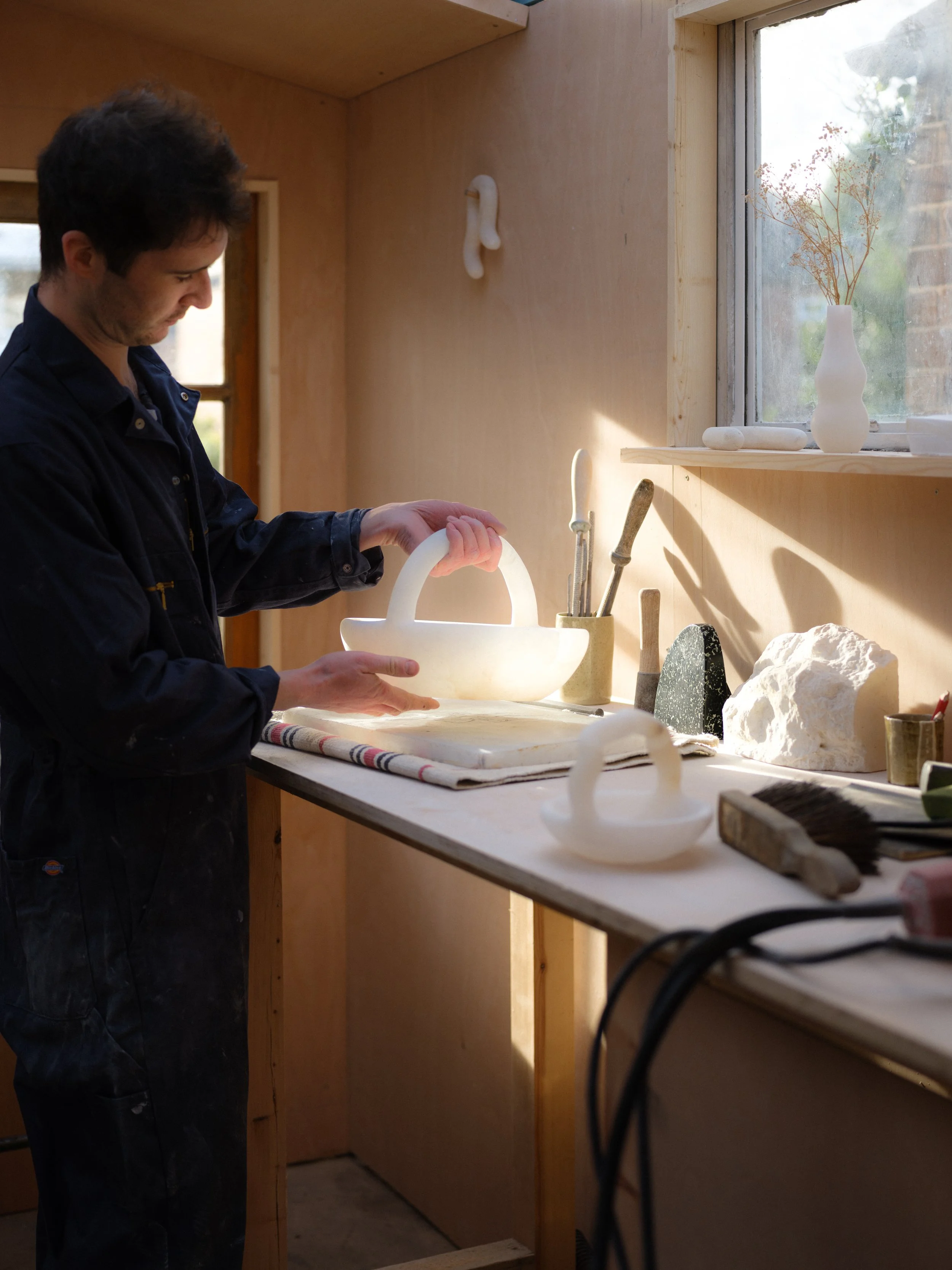 THE COLLECTION IS MADE UP OF VASES, BASKETS AND SCULPTURAL FORMS THAT SIT SOMEWHERE BETWEEN. SOME PIECES WERE MADE AS PAIRS, INTENDED TO BE EACH OTHER’S NEGATIVE IMAGE. OTHERS CONTINUE MY INVESTIGATION BETWEEN LIGHT AND ALABASTER AND EXPLORE THE TRANSLUCENCY OF THE MATERIAL. "